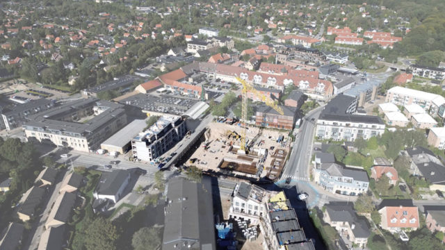 2025 SEPTEMBER 12 | Two out of three buildings reached full construction height. Construction of the third and last foundation just started. The three appartment buidlings are all a part the masterplan for Allerød Kulturtorv: An area within close reach to the train station and with a potention of a more effective use of the valuable urban space. This approach creates attractive urban housing as a strong alternative to the detached single-family home, new community facilities to strengthen city center life, and a series of high-quality urban spaces for the benefit and enjoyment of everyone. All of it is carefully adapted to the context and scale, featuring a green connection leading directly into the forest.